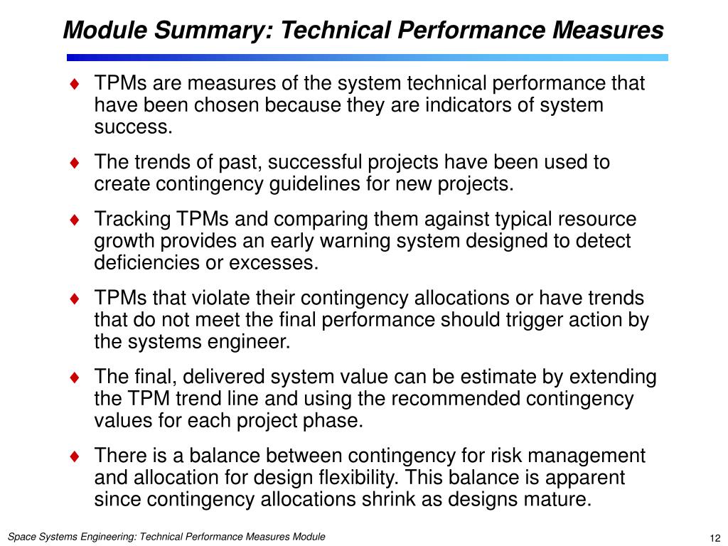 Module Summary: Technical Performance Measures • TPMs are measures of the system technical performance that have been chosen because they are indicators of system success. • The trends of past, successful projects have been used to create contingency guidelines for new projects. • Tracking TPMs and comparing them against typical resource growth provides an early warning system designed to detect deficiencies or excesses. • TPMs that violate their contingency allocations or have trends that do not meet the final performance should trigger action by the systems engineer. • The final, delivered system value can be estimate by extending the TPM trend line and using the recommended contingency values for each project phase. • There is a balance between contingency for risk management and allocation for design flexibility. This balance is apparent since contingency allocations shrink as designs mature.