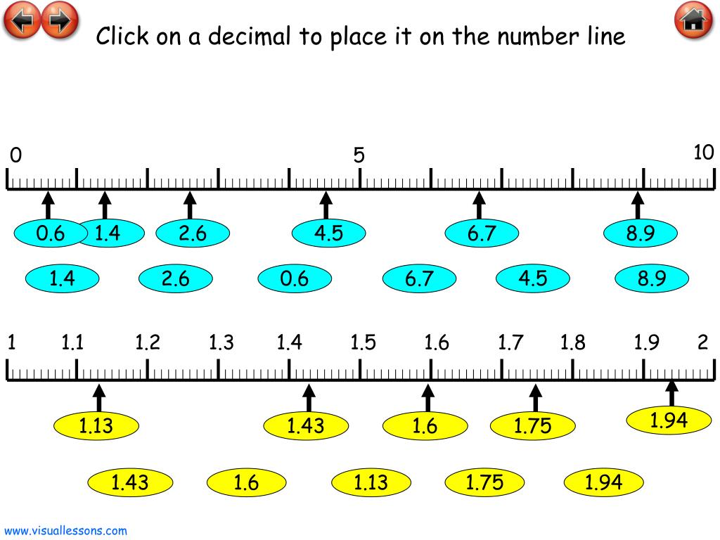 Click on a decimal to place it on the number line 10 0 5 0.6 1.4 2.6 4.5 6.7 8.9 4.5 8.9 1.4 2.6 0.6 6.7 1 1.1 1.2 1.3 1.4 1.5 1.6 1.7 1.8 1.9 2 1.94 1.13 1.43 1.6 1.75 1.75 1.94 1.43 1.6 1.13