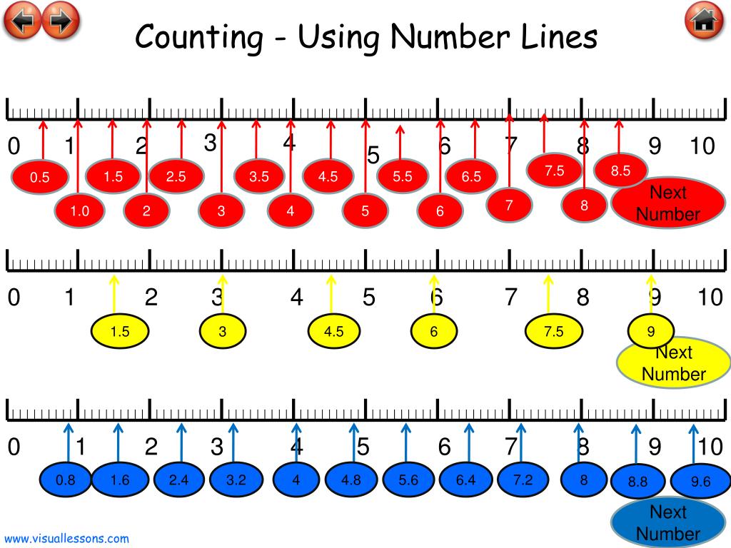 Counting - Using Number Lines 3 4 0 1 2 6 7 8 9 10 5 7.5 8.5 1.5 2.5 3.5 4.5 5.5 6.5 0.5 Next Number 7 8 1.0 2 3 4 5 6 0 1 2 3 4 5 6 7 8 9 10 1.5 3 4.5 6 7.5 9 Next Number 0 1 2 3 4 5 6 7 8 9 10 0.8 1.6 2.4 3.2 4 4.8 5.6 6.4 7.2 8 9.6 8.8 Next Number www.visuallessons.com