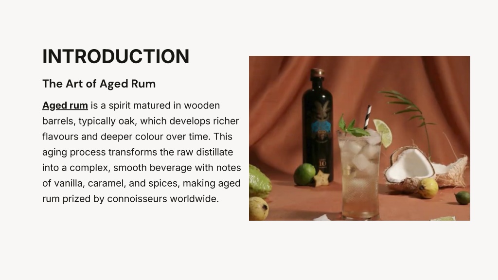 INTRODUCTION The Art of Aged Rum Aged rum is a spirit matured in wooden barrels, typically oak, which develops richer flavours and deeper colour over time. This aging process transforms the raw distillate into a complex, smooth beverage with notes of vanilla, caramel, and spices, making aged rum prized by connoisseurs worldwide.
