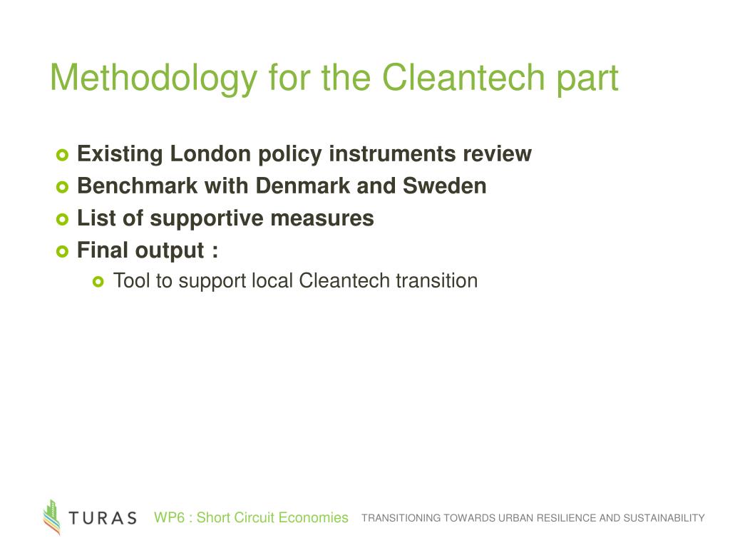 Methodology for the Cleantech part • Existing London policy instruments review • Benchmark with Denmark and Sweden • List of supportive measures • Final output : • Tool to support local Cleantech transition WP6 : Short Circuit Economies