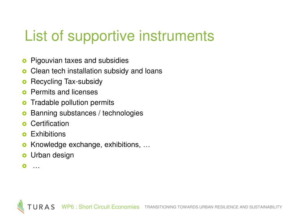 List of supportive instruments • Pigouvian taxes and subsidies • Clean tech installation subsidy and loans • Recycling Tax-subsidy • Permits and licenses • Tradable pollution permits • Banning substances / technologies • Certification • Exhibitions • Knowledge exchange, exhibitions, … • Urban design • … WP6 : Short Circuit Economies