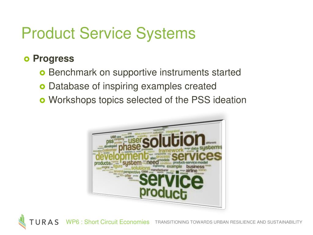 Product Service Systems • Progress • Benchmark on supportive instruments started • Database of inspiring examples created • Workshops topics selected of the PSS ideation WP6 : Short Circuit Economies