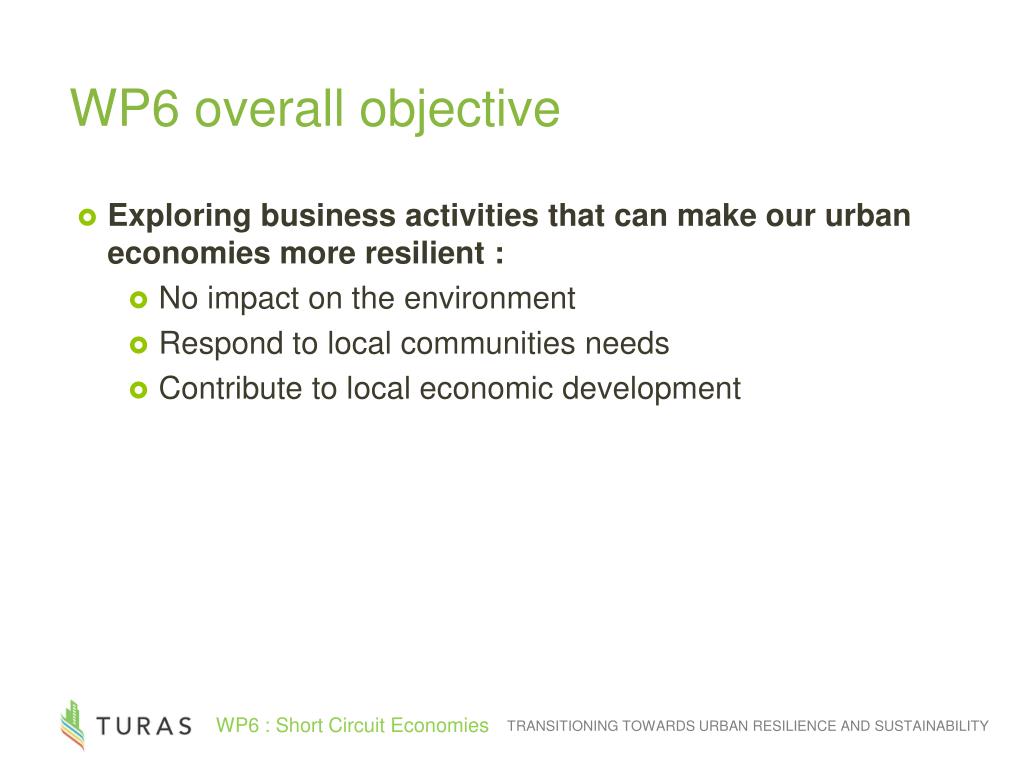 WP6 overall objective • Exploring business activities that can make our urban economies more resilient : • No impact on the environment • Respond to local communities needs • Contribute to local economic development WP6 : Short Circuit Economies