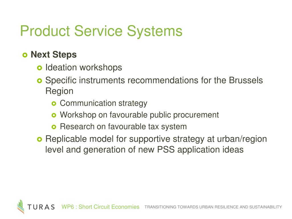 Product Service Systems • Next Steps • Ideation workshops • Specific instruments recommendations for the Brussels Region • Communication strategy • Workshop on favourable public procurement • Research on favourabletax system • Replicable model for supportive strategy at urban/region level and generation of new PSS application ideas WP6 : Short Circuit Economies