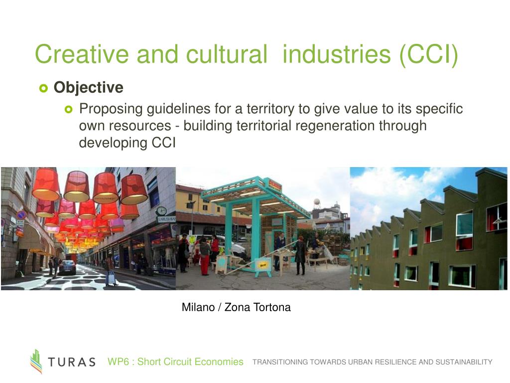 Creative and cultural industries (CCI) • Objective • Proposing guidelines for a territory to give value to its specific own resources - building territorial regeneration through developing CCI Milano / ZonaTortona WP6 : Short Circuit Economies