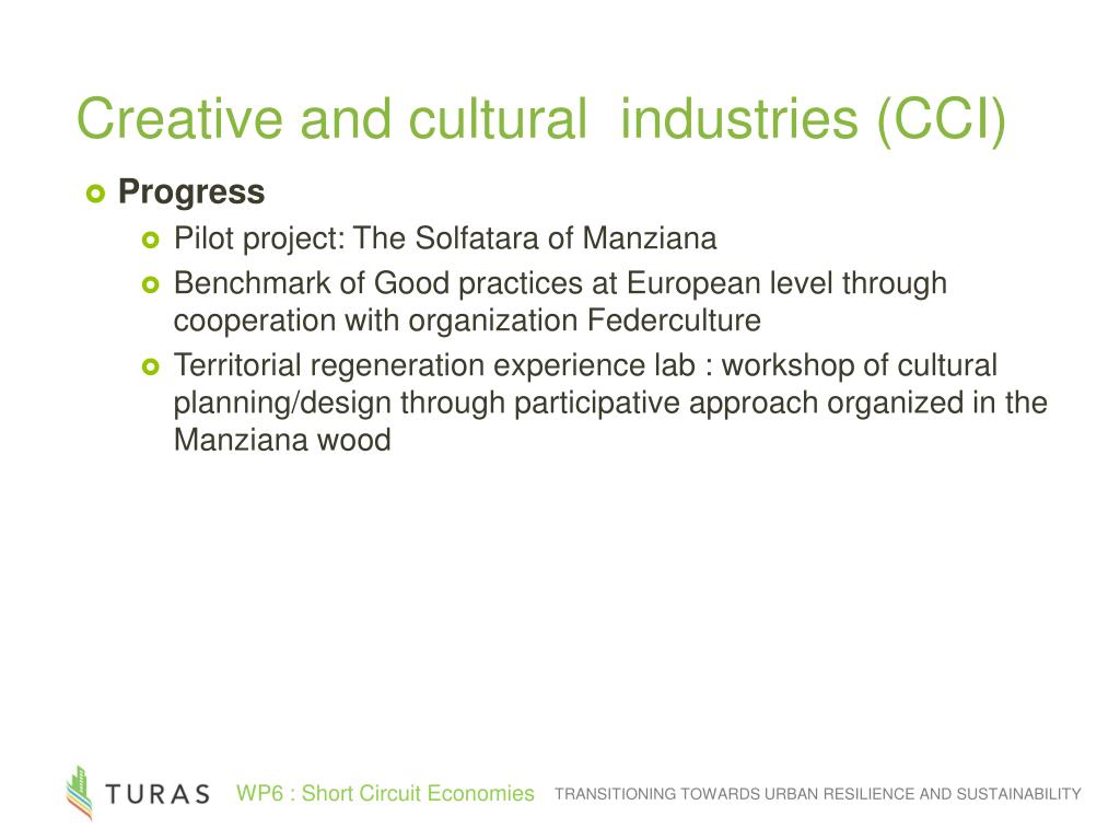 Creative and cultural industries (CCI) • Progress • Pilot project: The Solfatara of Manziana • Benchmark of Good practices at European level through cooperation with organization Federculture • Territorial regeneration experience lab : workshop of cultural planning/design through participative approach organized in the Manziana wood WP6 : Short Circuit Economies