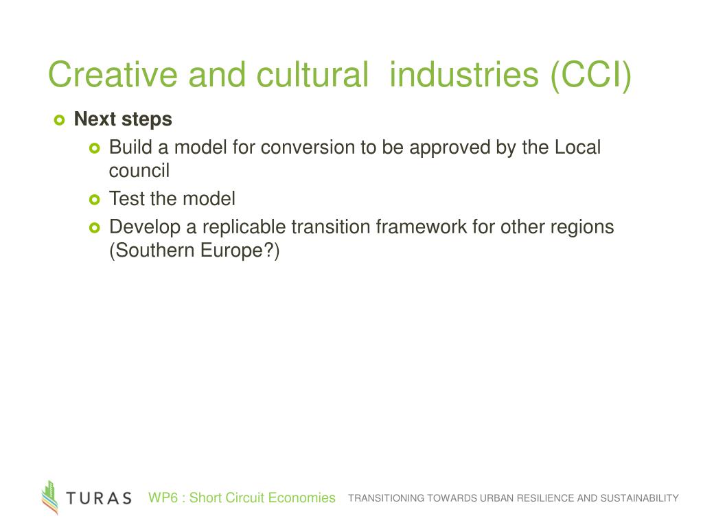 Creative and cultural industries (CCI) • Next steps • Build a model for conversion to be approved by the Local council • Test the model • Develop a replicable transition framework for other regions (Southern Europe?) WP6 : Short Circuit Economies