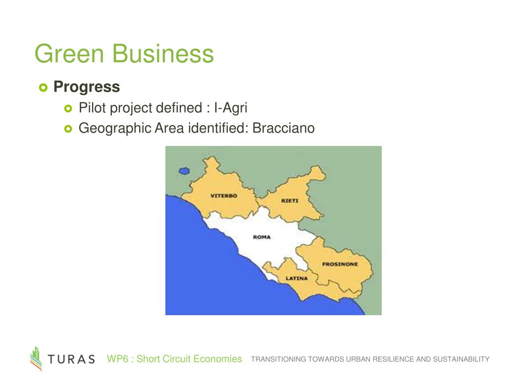 Green Business • Progress • Pilot project defined : I-Agri • Geographic Area identified: Bracciano WP6 : Short Circuit Economies