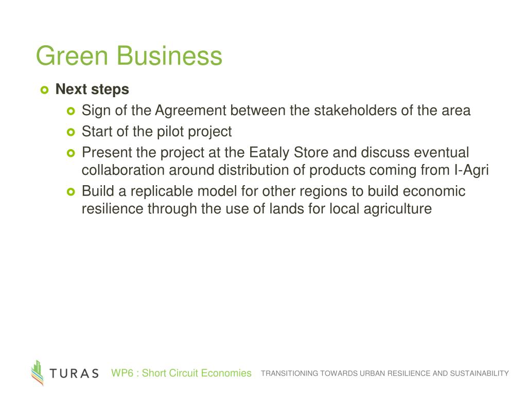 Green Business • Next steps • Sign of the Agreement between the stakeholders of the area • Start of the pilot project • Present the project at the Eataly Store and discuss eventual collaboration around distribution of products coming from I-Agri • Build a replicable model for other regions to build economic resilience through the use of lands for local agriculture WP6 : Short Circuit Economies