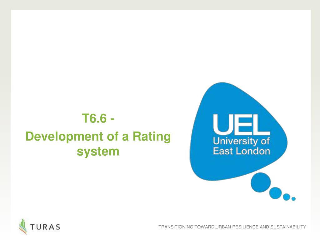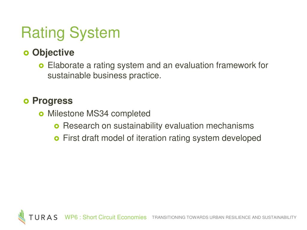 Rating System • Objective • Elaborate a rating system and an evaluation framework for sustainable business practice. • Progress • Milestone MS34 completed • Research on sustainability evaluation mechanisms • First draft model of iteration rating system developed WP6 : Short Circuit Economies