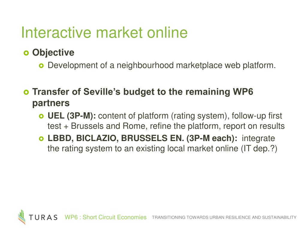 Interactive market online • Objective • Development of a neighbourhood marketplace web platform. • Transfer of Seville’s budget to the remaining WP6 partners • UEL(3P-M): content of platform (rating system), follow-up first test + Brussels and Rome, refine the platform, report on results • LBBD, BICLAZIO, BRUSSELS EN. (3P-M each): integrate the rating system to an existing local market online (IT dep.?) WP6 : Short Circuit Economies