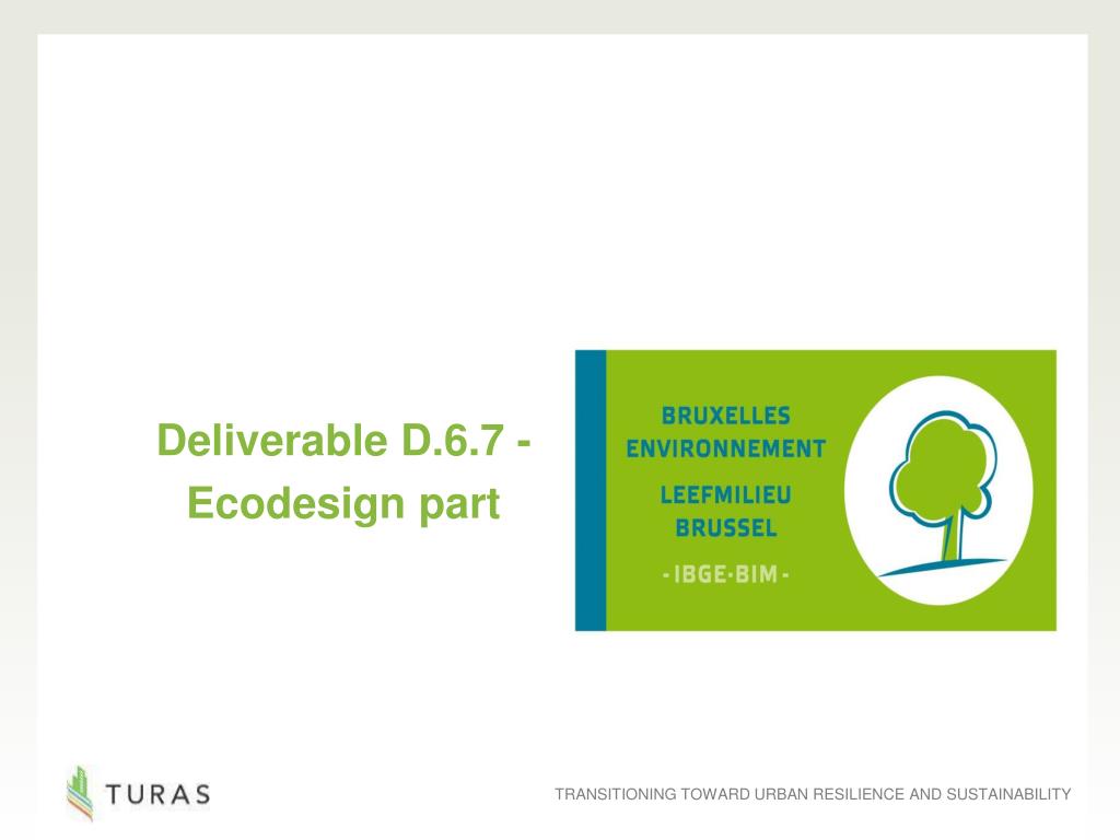 Methodology for the Ecodesign part • Existing Belgian policy instruments review • Benchmark • Generation of new innovative instruments • 2 Workshops • Culture and art industry in Brussels • Social entrepreneurs • Final Output • Framework for mainstreaming Ecodesign at urban level • 3 specific recommendations to support Ecodesign WP6 : Short Circuit Economies