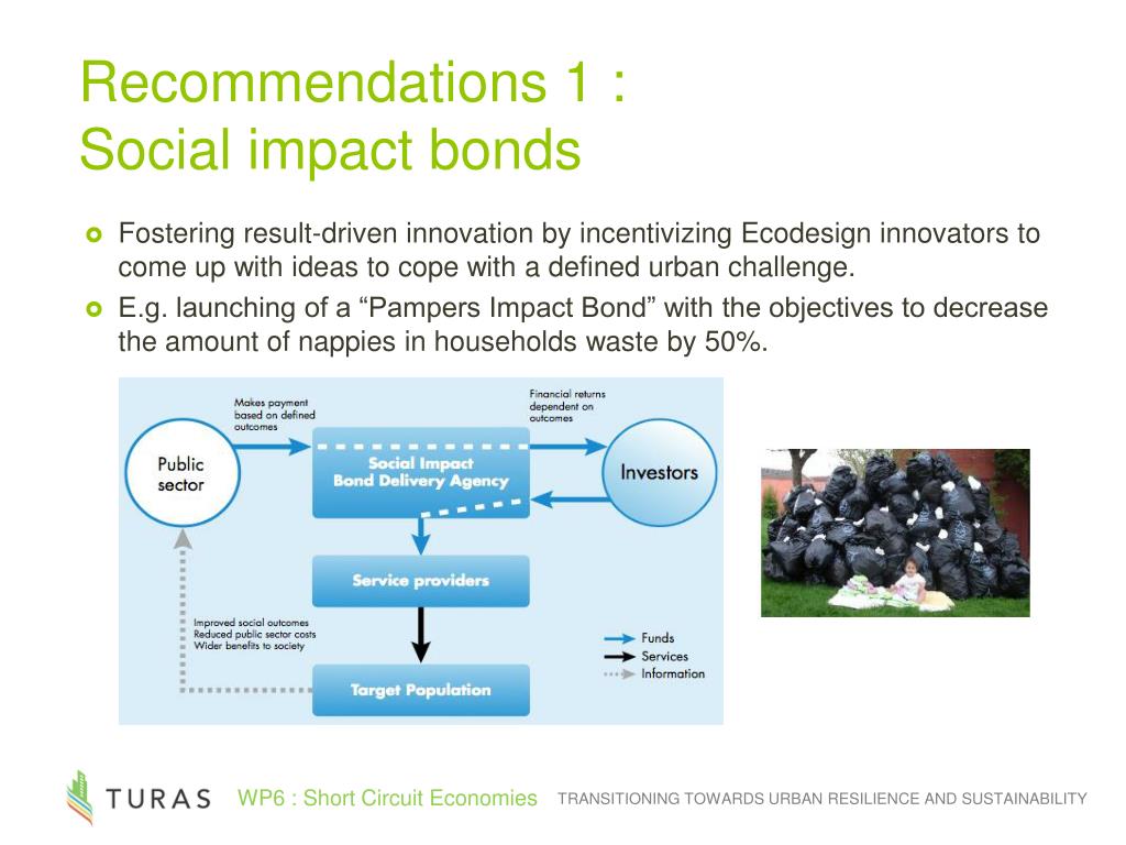Recommendations 1 : Social impact bonds • Fostering result-driven innovation by incentivizing Ecodesign innovators to come up with ideas to cope with a defined urban challenge. • E.g. launching of a “Pampers Impact Bond” with the objectives to decrease the amount of nappies in households waste by 50%. WP6 : Short Circuit Economies
