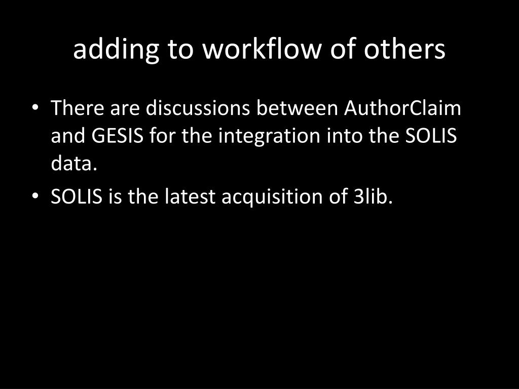 adding to workflow of others • There are discussions between AuthorClaim and GESIS for the integration into the SOLIS data. • SOLIS is the latest acquisition of 3lib.