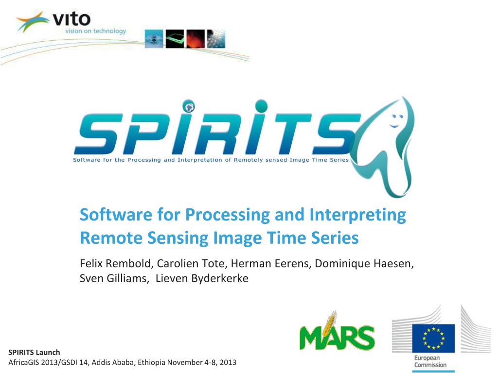 Software for Processing and Interpreting Remote Sensing Image Time Series Felix Rembold, Carolien Tote, Herman Eerens, Dominique Haesen, Sven Gilliams, Lieven Byderkerke SPIRITS Launch AfricaGIS 2013/GSDI 14, Addis Ababa, Ethiopia November 4-8, 2013