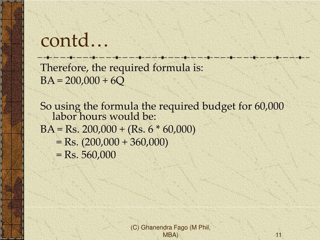contd… Therefore, the required formula is: BA = 200,000 + 6Q So using the formula the required budget for 60,000 labor hours would be: BA = Rs. 200,000 + (Rs. 6 * 60,000) = Rs. (200,000 + 360,000) = Rs. 560,000 (C) Ghanendra Fago (M Phil, MBA)