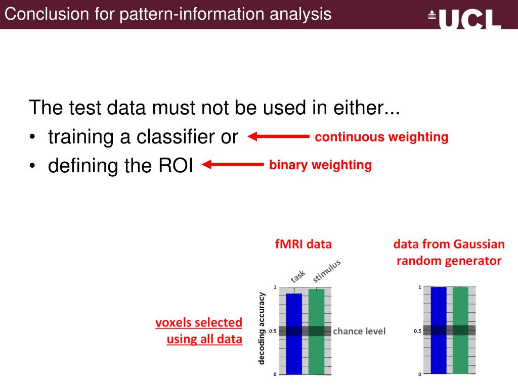 Conclusion for pattern-information analysis continuous weighting The test data must not be used in either... • training a classifier or • defining the ROI binary weighting