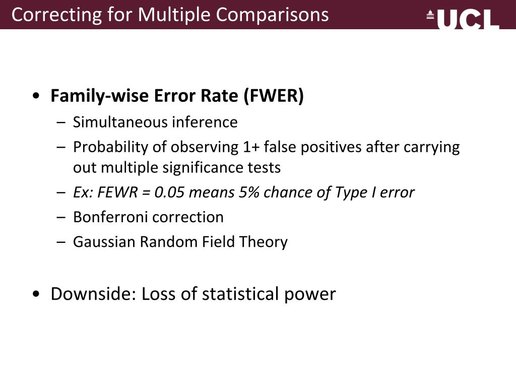 Correcting for Multiple Comparisons • Family-wise Error Rate (FWER) • Simultaneous inference • Probability of observing 1+ false positives after carrying out multiple significance tests • Ex: FEWR = 0.05 means 5% chance of Type I error • Bonferroni correction • Gaussian Random Field Theory • Downside: Loss of statistical power