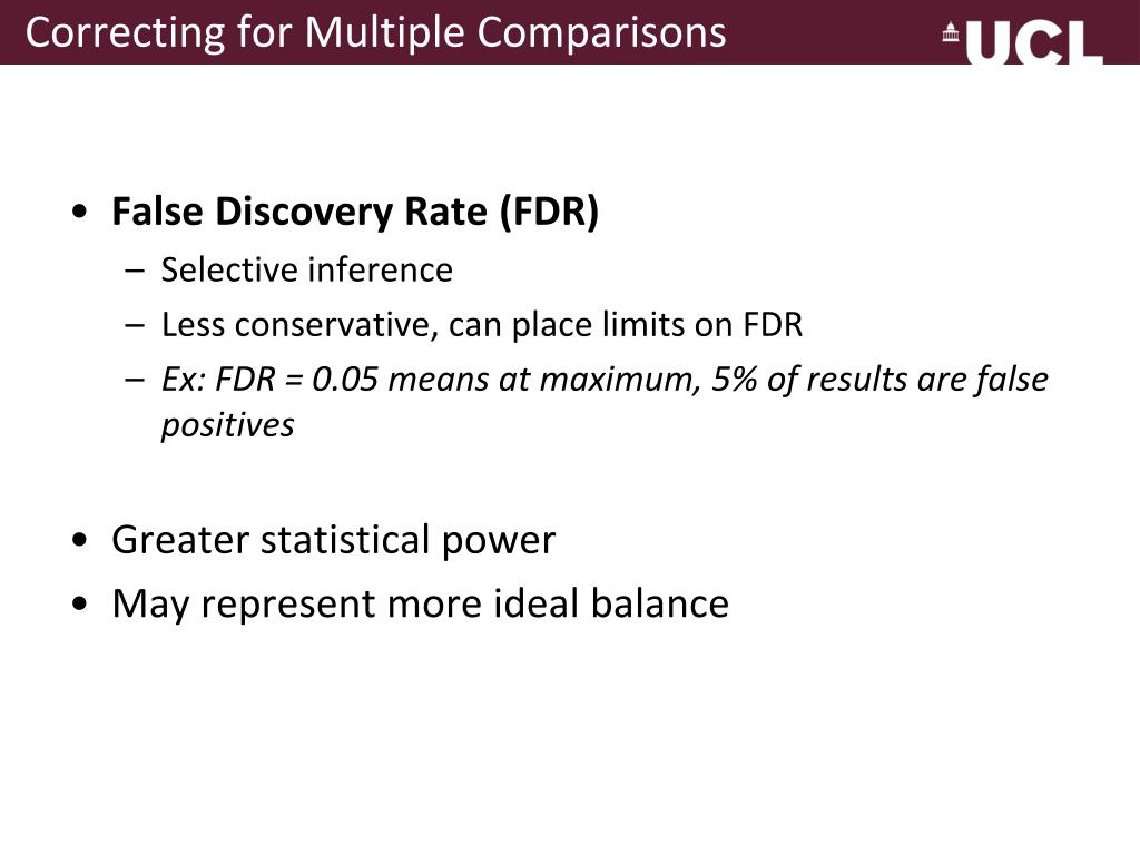 Correcting for Multiple Comparisons • False Discovery Rate (FDR) • Selective inference • Less conservative, can place limits on FDR • Ex: FDR = 0.05 means at maximum, 5% of results are false positives • Greater statistical power • May represent more ideal balance