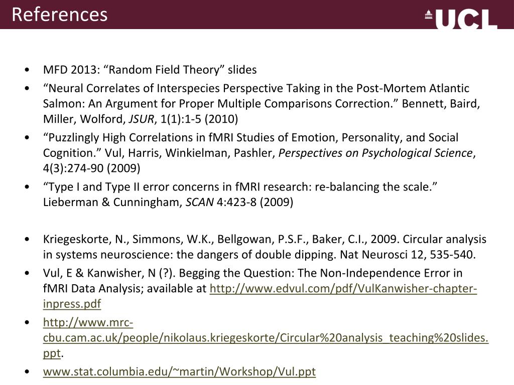References • MFD 2013: “Random Field Theory” slides • “Neural Correlates of Interspecies Perspective Taking in the Post-Mortem Atlantic Salmon: An Argument for Proper Multiple Comparisons Correction.” Bennett, Baird, Miller, Wolford, JSUR, 1(1):1-5 (2010) • “Puzzlingly High Correlations in fMRI Studies of Emotion, Personality, and Social Cognition.” Vul, Harris, Winkielman, Pashler, Perspectives on Psychological Science, 4(3):274-90 (2009) • “Type I and Type II error concerns in fMRI research: re-balancing the scale.” Lieberman & Cunningham, SCAN 4:423-8 (2009) • Kriegeskorte, N., Simmons, W.K., Bellgowan, P.S.F., Baker, C.I., 2009. Circular analysis in systems neuroscience: the dangers of double dipping. Nat Neurosci 12, 535-540. • Vul, E & Kanwisher, N (?). Begging the Question: The Non-Independence Error in fMRI Data Analysis; available at http://www.edvul.com/pdf/VulKanwisher-chapter-inpress.pdf • http://www.mrc-cbu.cam.ac.uk/people/nikolaus.kriegeskorte/Circular%20analysis_teaching%20slides.ppt. • www.stat.columbia.edu/~martin/Workshop/Vul.ppt