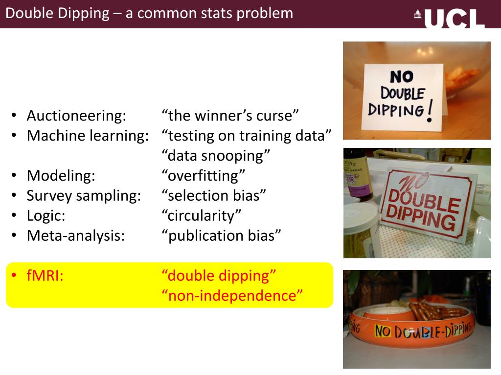 Double Dipping – a common stats problem • Auctioneering: “the winner’s curse” • Machine learning: “testing on training data” • “data snooping” • Modeling: “overfitting” • Survey sampling: “selection bias” • Logic: “circularity” • Meta-analysis: “publication bias” • fMRI: “double dipping” • “non-independence”