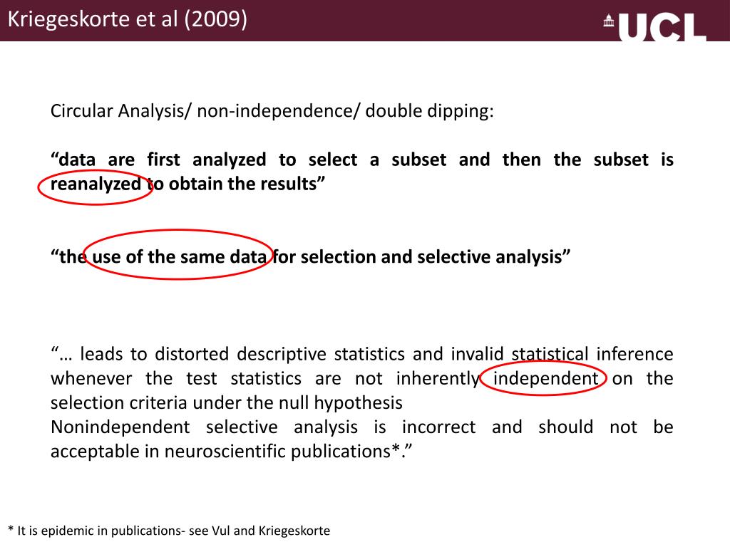 Kriegeskorte et al (2009) Circular Analysis/ non-independence/ double dipping: “data are first analyzed to select a subset and then the subset is reanalyzed to obtain the results” “the use of the same data for selection and selective analysis” “… leads to distorted descriptive statistics and invalid statistical inference whenever the test statistics are not inherently independent on the selection criteria under the null hypothesis Nonindependent selective analysis is incorrect and should not be acceptable in neuroscientific publications*.” * It is epidemic in publications- see Vul and Kriegeskorte