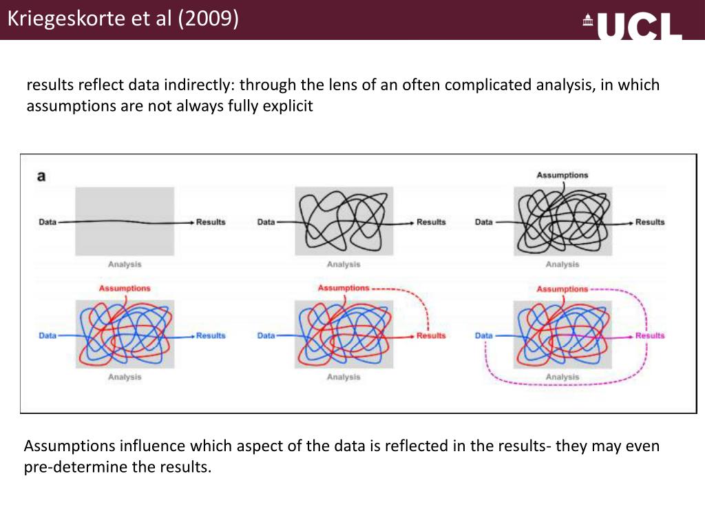 Kriegeskorte et al (2009) results reflect data indirectly: through the lens of an often complicated analysis, in which assumptions are not always fully explicit Assumptions influence which aspect of the data is reflected in the results- they may even pre-determine the results.