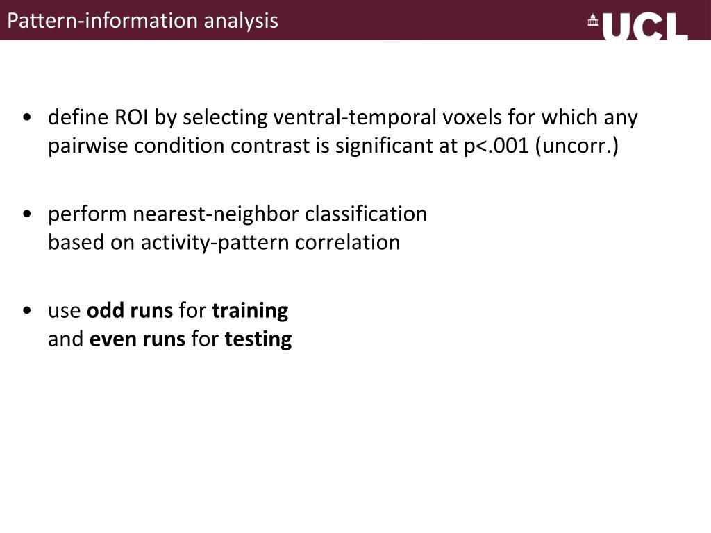 Pattern-information analysis define ROI by selecting ventral-temporal voxels for which any pairwise condition contrast is significant at p<.001 (uncorr.) perform nearest-neighbor classificationbased on activity-pattern correlation use oddruns for trainingand evenruns for testing