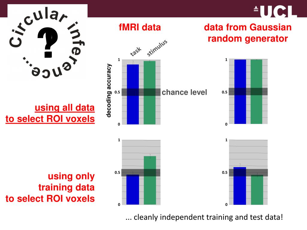 stimulus task decoding accuracy chance level ! ? fMRI data data from Gaussian random generator using all data to select ROI voxels 1 1 1 1 using only training data to select ROI voxels 0.5 0.5 0.5 0.5 0 0 0 0 ... cleanly independent training and test data!