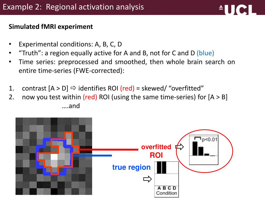 Example 2: Regional activation analysis • Simulated fMRI experiment • Experimental conditions: A, B, C, D • “Truth”: a region equally active for A and B, not for C and D (blue) • Time series: preprocessed and smoothed, then whole brain search on entire time-series (FWE-corrected): • contrast [A > D] identifies ROI (red) = skewed/ “overfitted” • now you test within (red) ROI (using the same time-series) for [A > B] • ….and overfitted ROI true region