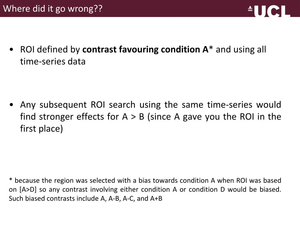 Where did it go wrong?? ROI defined by contrast favouring condition A* and using all time-series data Any subsequent ROI search using the same time-series would find stronger effects for A > B (since A gave you the ROI in the first place) *because the region was selected with a bias towards condition A when ROI was based on [A>D] so any contrast involving either condition A or condition D would be biased. Such biased contrasts include A, A-B, A-C, and A+B