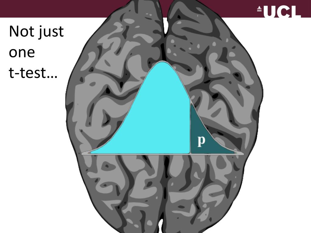 t > 2.5 t > 4.5 t > 0.5 t > 1.5 t > 3.5 t > 5.5 t > 6.5 Inference on t-maps • Around 60,000 voxels to image the brain • 60,000 t-tests with α=0.05 3000 Type I errors! • Adjust the threshold t > 0.5 2013 MFD Random Field Theory