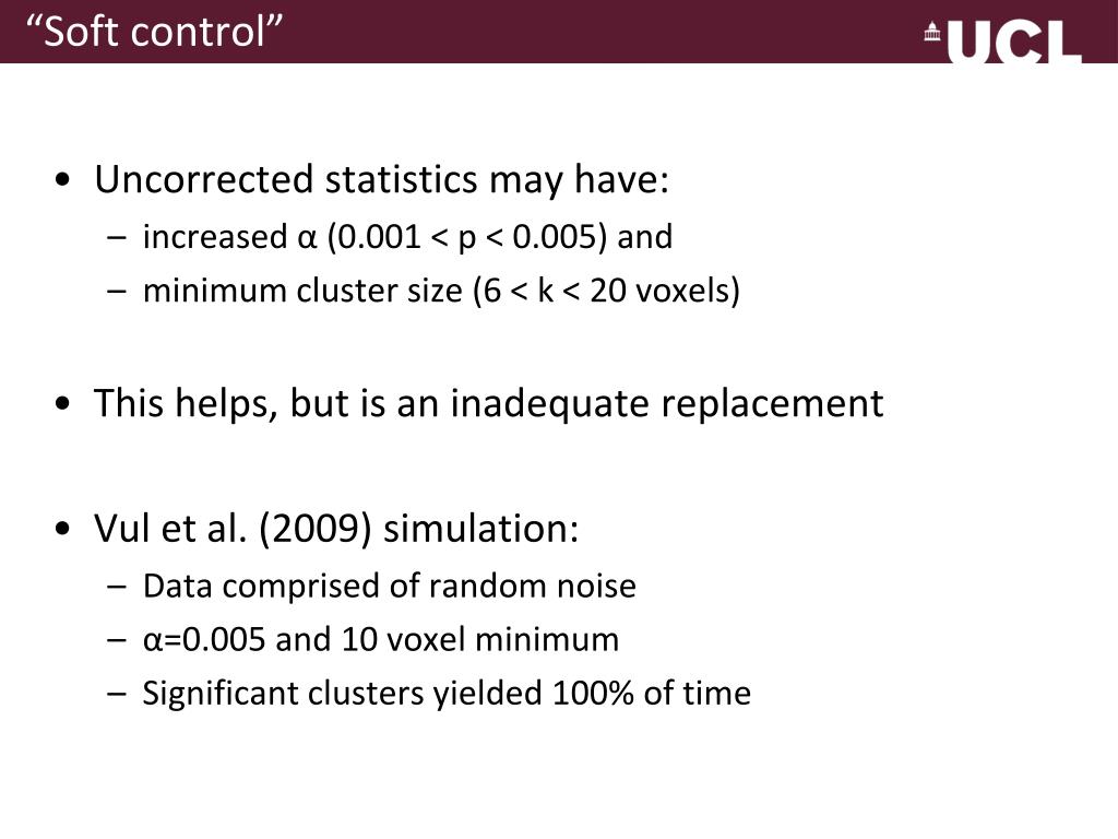 “Soft control” • Uncorrected statistics may have: • increased α (0.001 < p < 0.005) and • minimum cluster size (6 < k < 20 voxels) • This helps, but is an inadequate replacement • Vul et al. (2009) simulation: • Data comprised of random noise • α=0.005 and 10 voxel minimum • Significant clusters yielded 100% of time