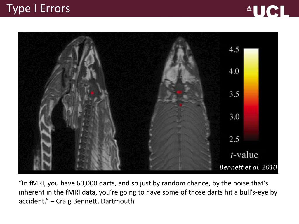 Type I Errors • Bennett et al. 2010 “In fMRI, you have 60,000 darts, and so just by random chance, by the noise that’s inherent in the fMRI data, you’re going to have some of those darts hit a bull’s-eye by accident.” – Craig Bennett, Dartmouth