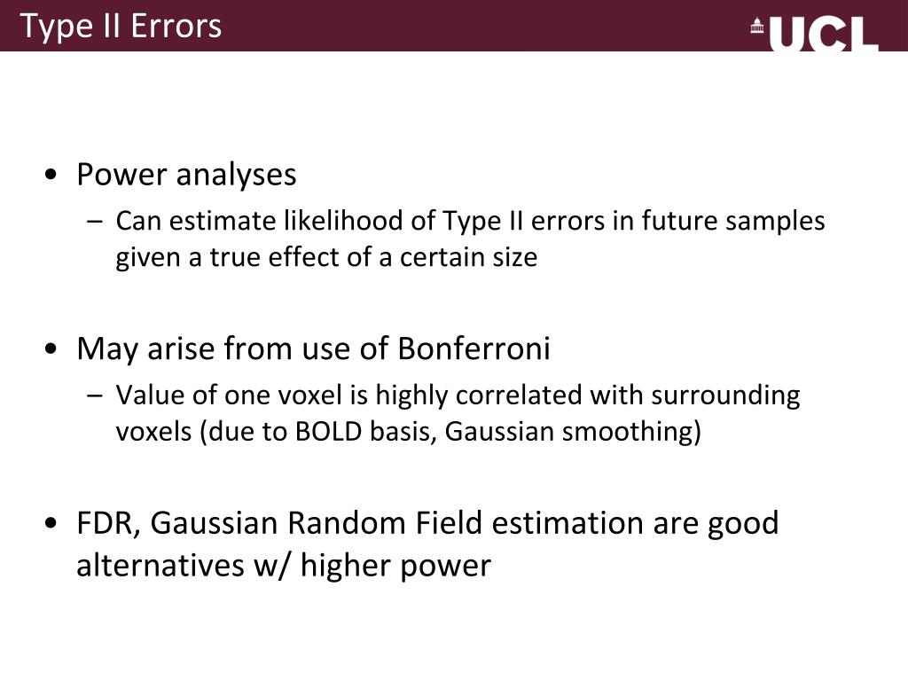 Type II Errors • Power analyses • Can estimate likelihood of Type II errors in future samples given a true effect of a certain size • May arise from use of Bonferroni • Value of one voxel is highly correlated with surrounding voxels (due to BOLD basis, Gaussian smoothing) • FDR, Gaussian Random Field estimation are good alternatives w/ higher power