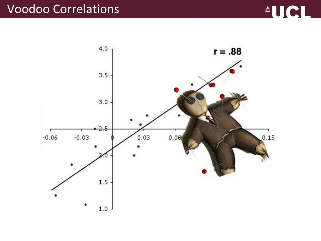 Generalisations (from Vul) • Whenever the same data and measure are used to select voxels and later assess their signal: • Effect sizes will be inflated (e.g., correlations) • Data plots will be distorted and misleading • Null-hypothesis tests will be invalid • Only the selection step may be used for inference • If multiple comparisons are inadequate, results may be produced from pure noise.