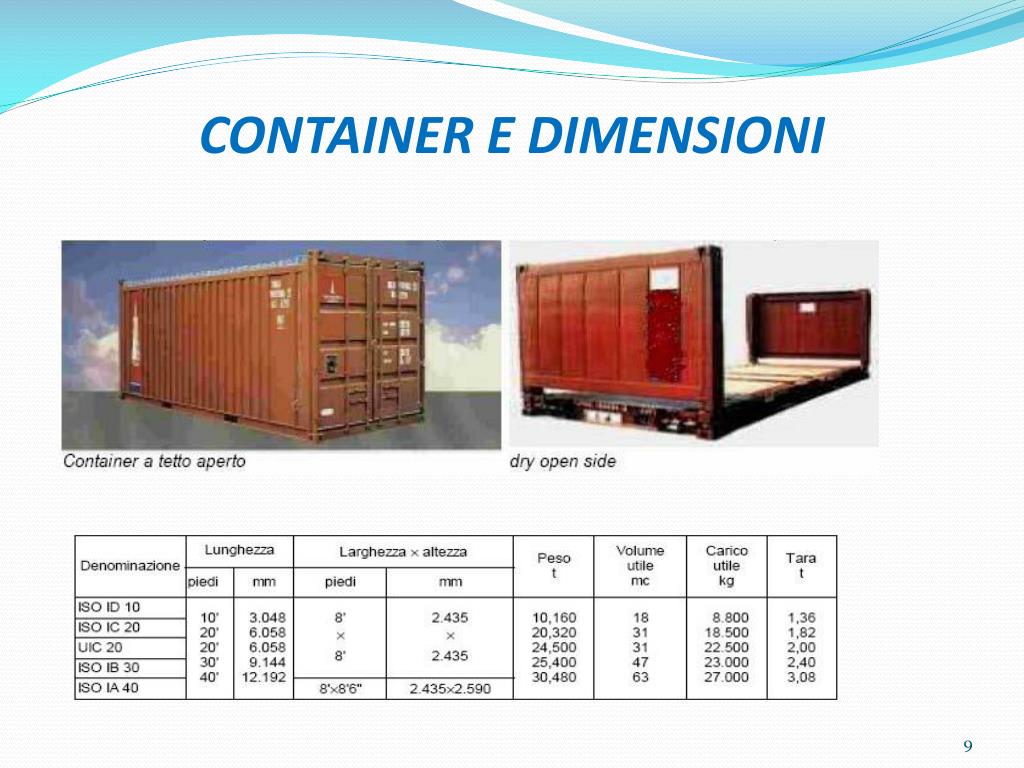 ALCUNI DATI TECNICI I containers hanno una larghezza comune di 8 piedi(244 cm) e una altezza comune di 8 piedi e 6 pollici (259 cm), mentre si trovano due lunghezze standard di 20 e di 40 piedi (610 e 1220 cm). In seguito alla standardizzazione dei container è sorta la consuetudine di valutare la capacità di carico di una nave portacontainer in: TEU (Twenty-Foot-Equivalent Unit)(Unità equivalente a container da 20 piedi).