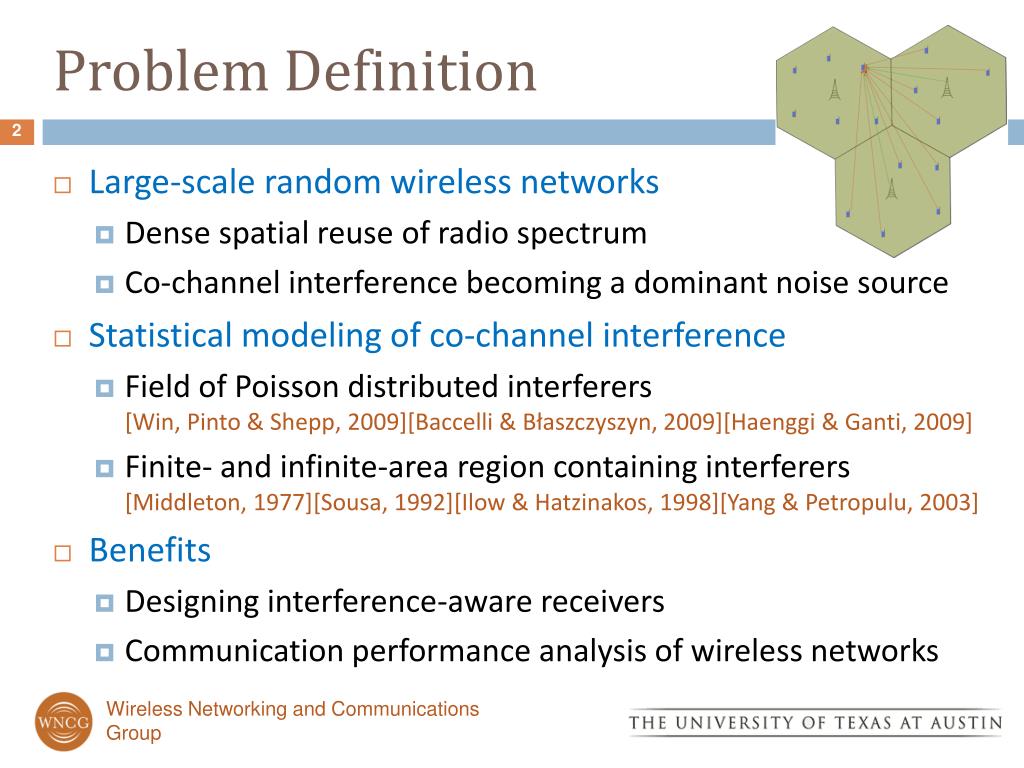 Problem Definition • Large-scale random wireless networks • Dense spatial reuse of radio spectrum • Co-channel interference becoming a dominant noise source • Statistical modeling of co-channel interference • Field of Poisson distributed interferers[Win, Pinto & Shepp, 2009][Baccelli & Błaszczyszyn, 2009][Haenggi & Ganti, 2009] • Finite- and infinite-area region containing interferers[Middleton, 1977][Sousa, 1992][Ilow & Hatzinakos, 1998][Yang & Petropulu, 2003] • Benefits • Designing interference-aware receivers • Communication performance analysis of wireless networks Wireless Networking and Communications Group