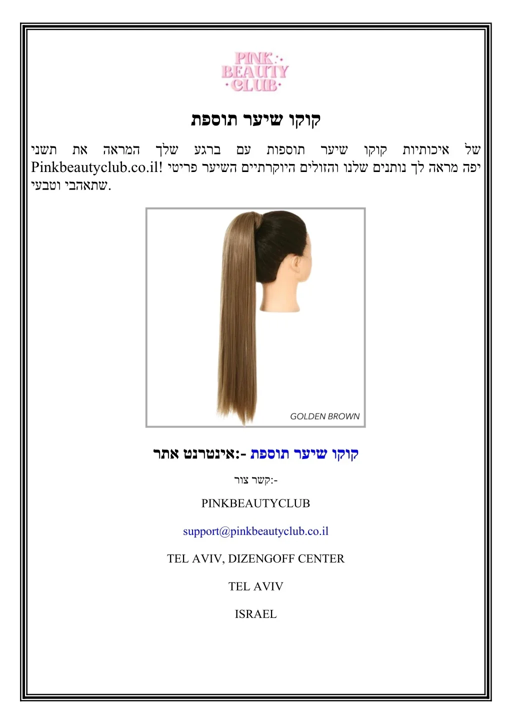 תפסות רעיש וקוק ינשת Pinkbeautyclub.co.il! יטירפ רעישה םייתרקויה םילוזהו ונלש םינתונ ךל הארמ הפי יעבטו יבהאתש. תא הארמה ךלש עגרב םע תופסות רעיש וקוק תויתוכיא לש רתא טנרטניא:- תפסות רעיש וקוק רוצ רשק:- PINKBEAUTYCLUB support@pinkbeautyclub.co.il TEL AVIV, DIZENGOFF CENTER TEL AVIV ISRAEL
