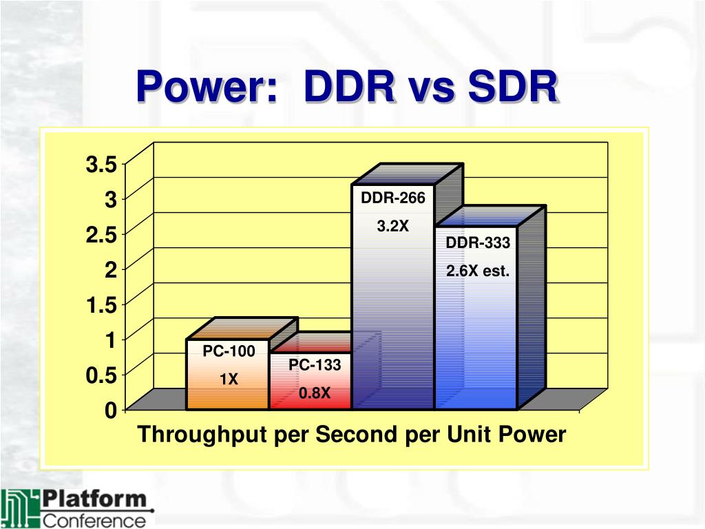 Power: DDR vs SDR DDR-266 3.2X DDR-333 2.6X est. PC-100 1X PC-133 0.8X