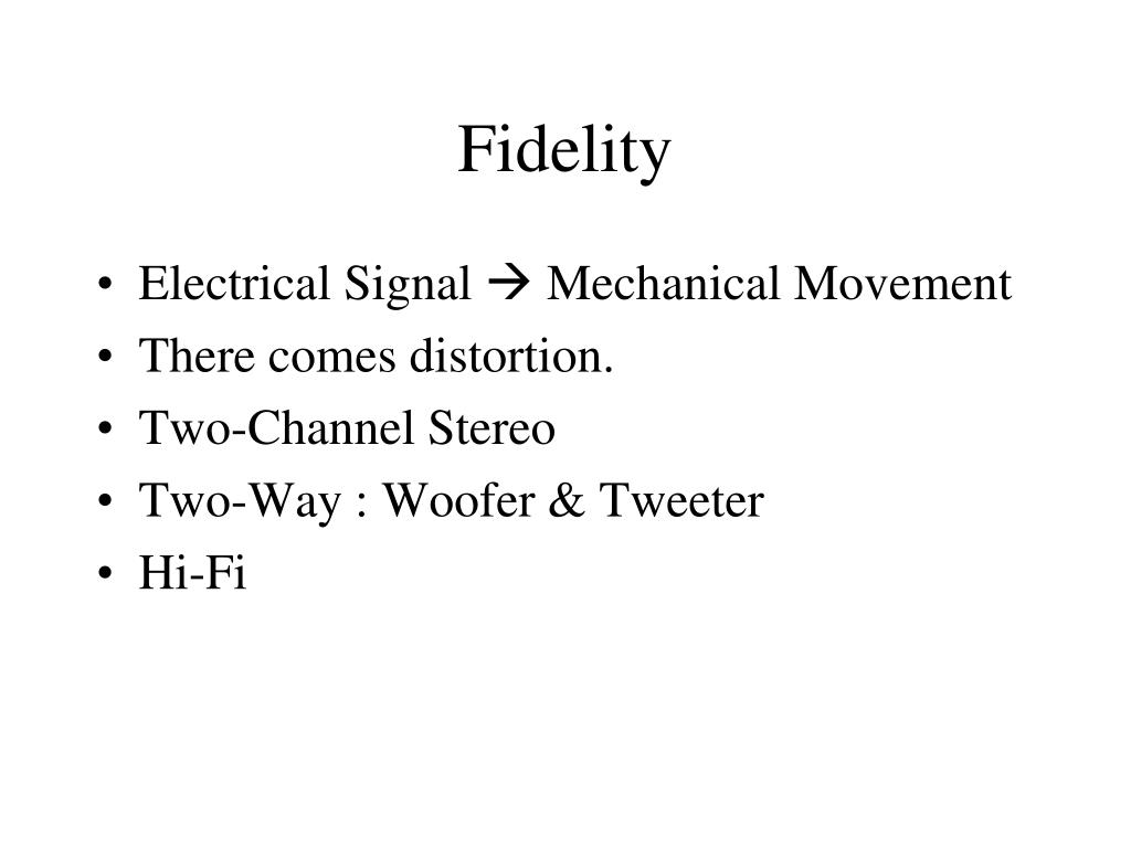 Fidelity • Electrical Signal Mechanical Movement • There comes distortion. • Two-Channel Stereo • Two-Way : Woofer & Tweeter • Hi-Fi