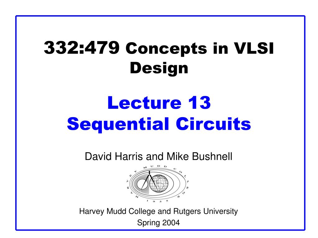 332:479 Concepts in VLSI Design Lecture 13 Sequential Circuits. David Harris and Mike Bushnell Harvey Mudd College and Rutgers University Spring 2004. Outline. Floorplanning Sequencing Sequencing Element Design Max and Min-Delay Clock Skew Two-Phase Clocking Summary.