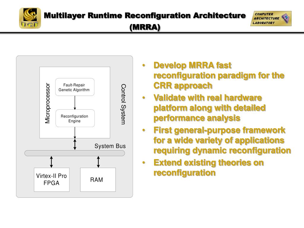 Multilayer Runtime Reconfiguration Architecture (MRRA) • Develop MRRA fast reconfiguration paradigm for the CRR approach • Validate with real hardware platform along with detailed performance analysis • First general-purpose framework for a wide variety of applications requiring dynamic reconfiguration • Extend existing theories on reconfiguration