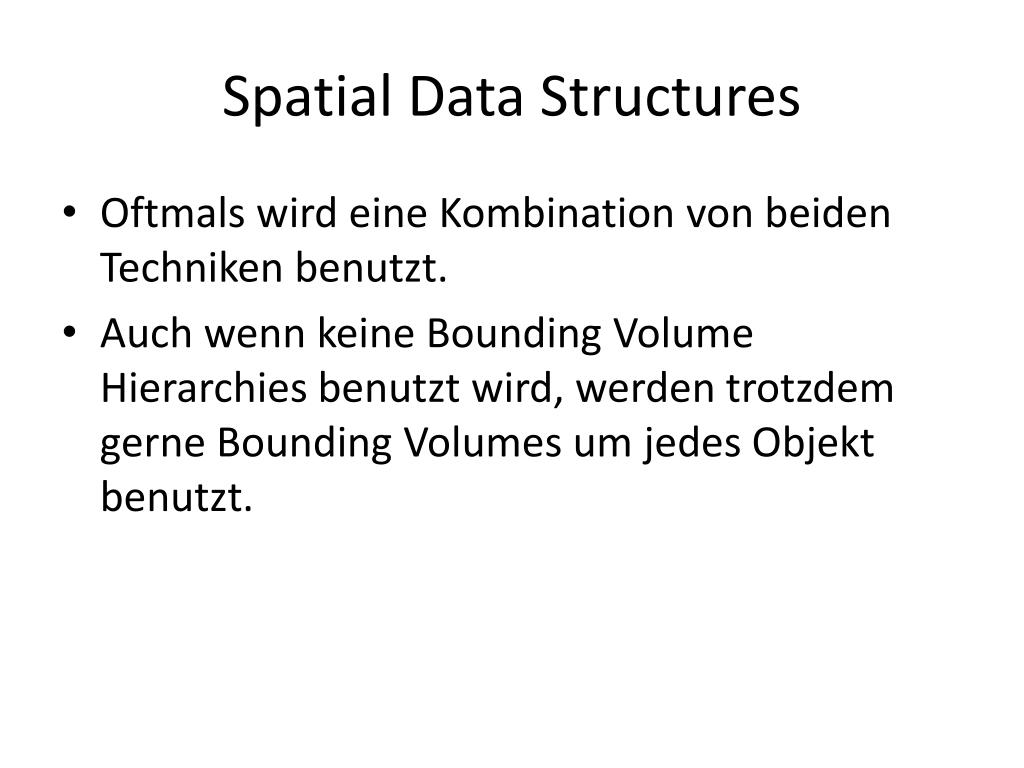 Spatial Data Structures • OftmalswirdeineKombination von beidenTechnikenbenutzt. • Auchwennkeine Bounding Volume Hierarchies benutztwird, werdentrotzdemgerne Bounding Volumes um jedesObjektbenutzt.