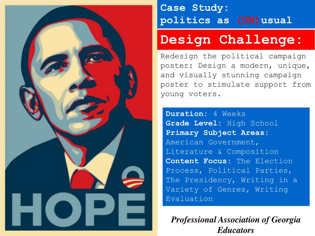 Case Study: politics as (UN)usual Design Challenge: Redesign the political campaign poster: Design a modern, unique, and visually stunning campaign poster to stimulate support from young voters.. Duration: 4 Weeks Grade Level: High School Primary Subject Areas: American Government, Literature & Composition Content Focus: The Election Process, Political Parties, The Presidency, Writing in a Variety of Genres, Writing Evaluation Professional Association of Georgia Educators