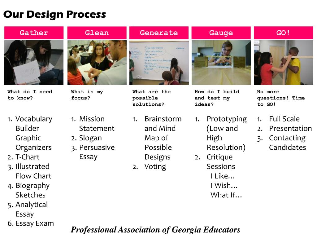 Our Design Process Gather Generate GO! Glean Gauge What do I need to know? Vocabulary Builder Graphic Organizers T-Chart Illustrated Flow Chart Biography Sketches Analytical Essay Essay Exam What is my focus? Mission Statement Slogan Persuasive Essay What are the possible solutions? Brainstorm and Mind Map of Possible Designs Voting • How do I build and test my ideas? • Prototyping (Low and High Resolution) • Critique Sessions • I Like… • I Wish… • What If… No more questions! Time to GO! Full Scale Presentation Contacting Candidates Professional Association of Georgia Educators