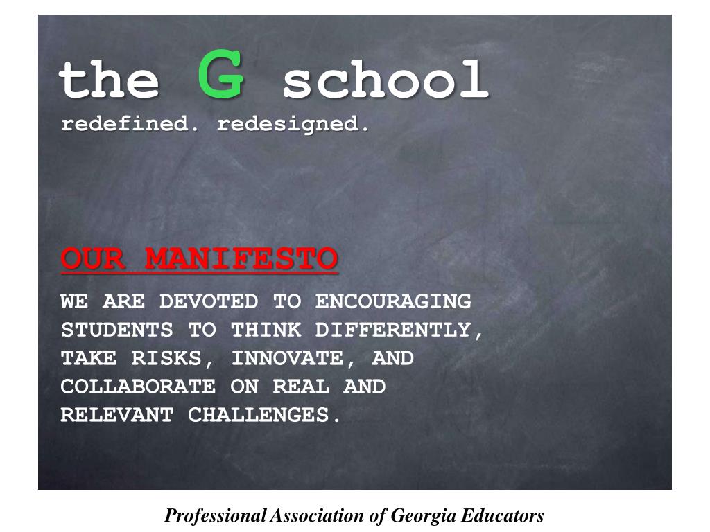 theGschool redefined. redesigned. OUR MANIFESTO WE ARE DEVOTED TO ENCOURAGING STUDENTS TO THINK DIFFERENTLY, TAKE RISKS, INNOVATE, AND COLLABORATE ON REAL AND RELEVANT CHALLENGES. Professional Association of Georgia Educators
