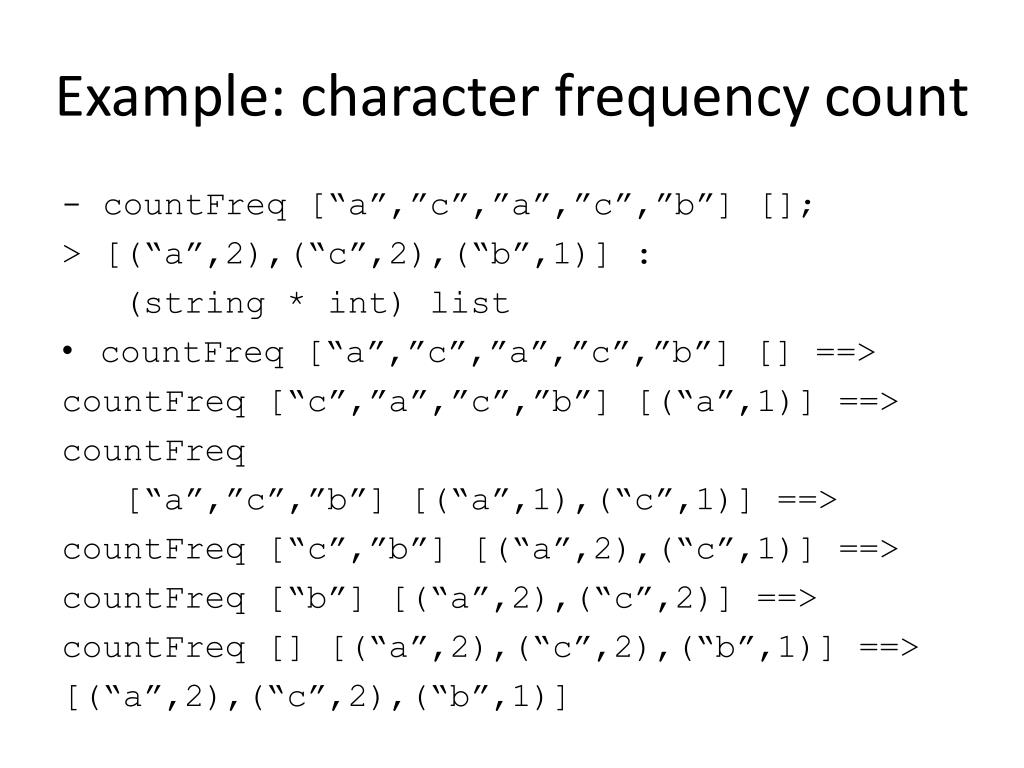 Example: character frequency count - countFreq [“a”,”c”,”a”,”c”,”b”] []; > [(“a”,2),(“c”,2),(“b”,1)] : (string * int) list • countFreq [“a”,”c”,”a”,”c”,”b”] [] ==> countFreq [“c”,”a”,”c”,”b”] [(“a”,1)] ==> countFreq [“a”,”c”,”b”] [(“a”,1),(“c”,1)] ==> countFreq [“c”,”b”] [(“a”,2),(“c”,1)] ==> countFreq [“b”] [(“a”,2),(“c”,2)] ==> countFreq [] [(“a”,2),(“c”,2),(“b”,1)] ==> [(“a”,2),(“c”,2),(“b”,1)]