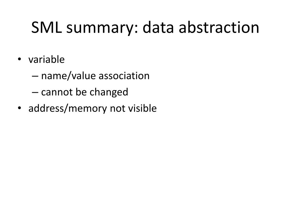 SML summary: data abstraction • variable • name/value association • cannot be changed • address/memory not visible